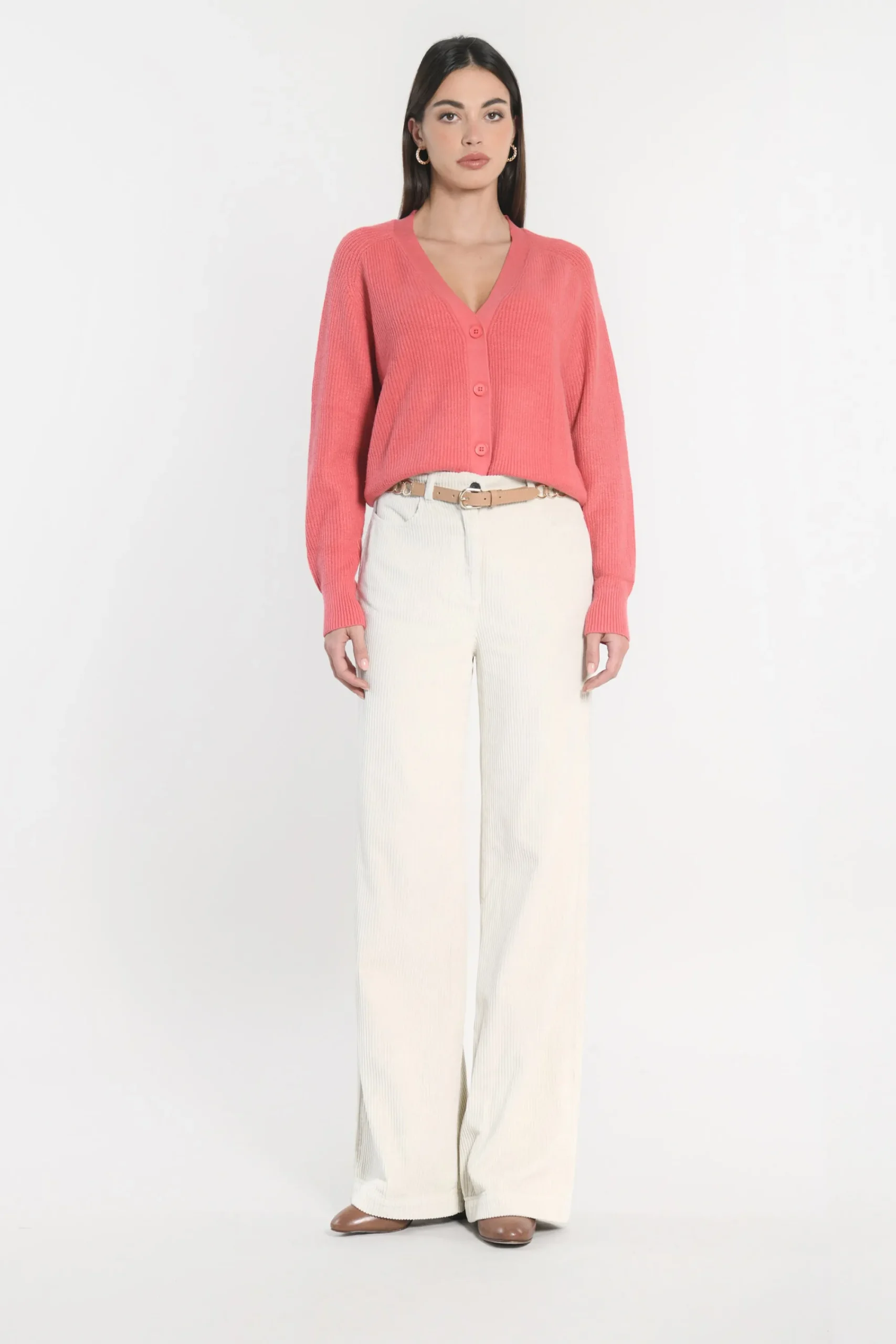 Gilet maille moelleuse tricotage fines côtesEncolure V bordée d’une bande ton sur ton full needleBoutonnage apparent m…