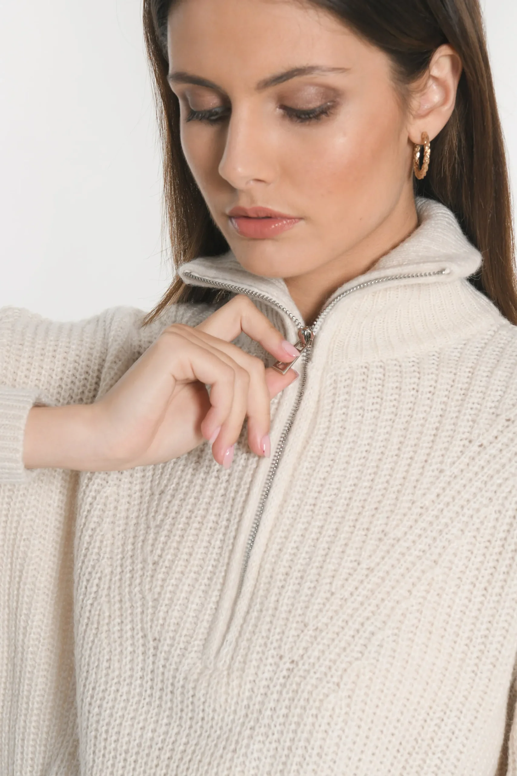 Pull camionneur grosse mailleContient de la laine et du mohairEncolure montante avec zip métalliqueJoli détail de tric…