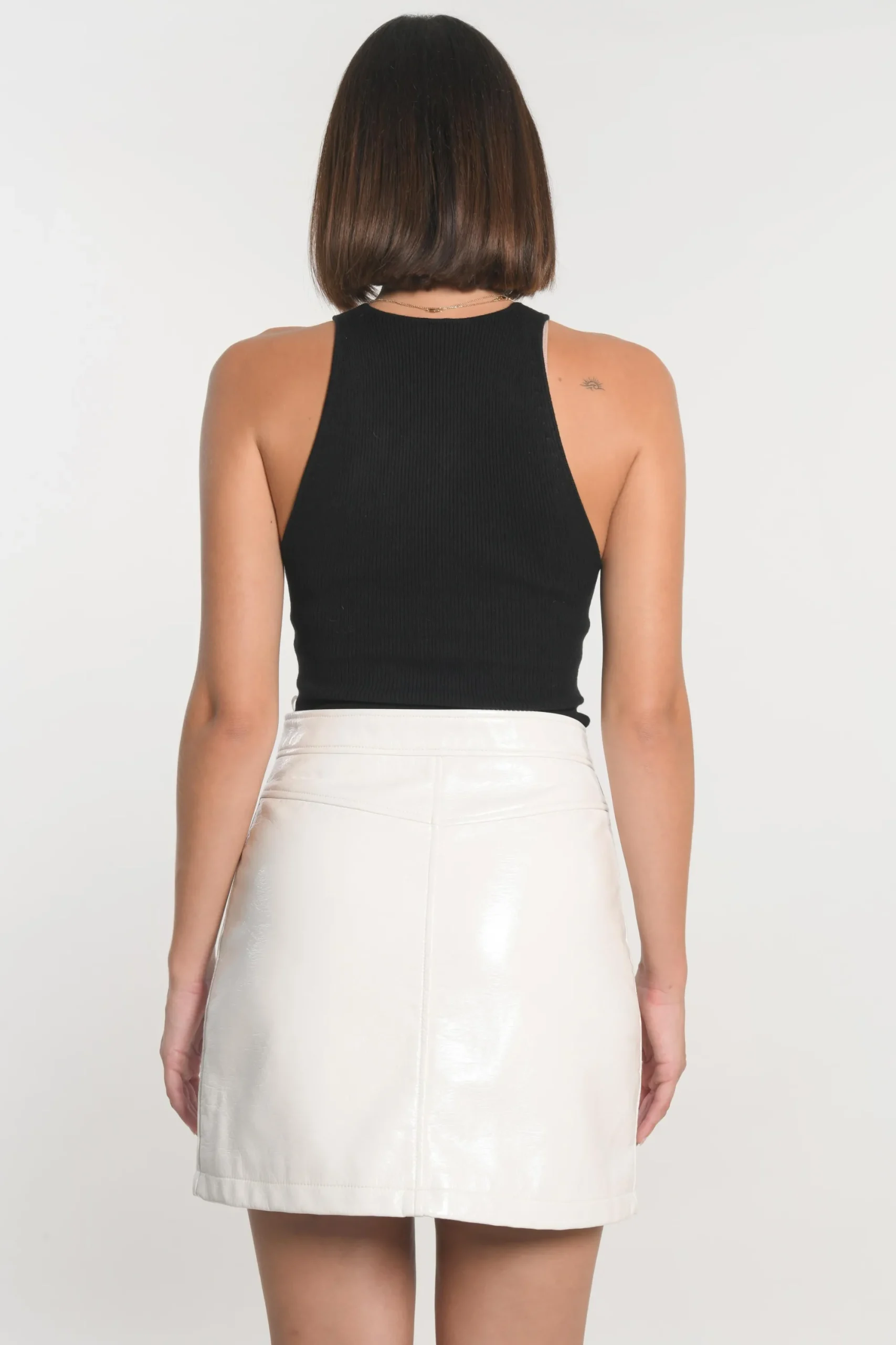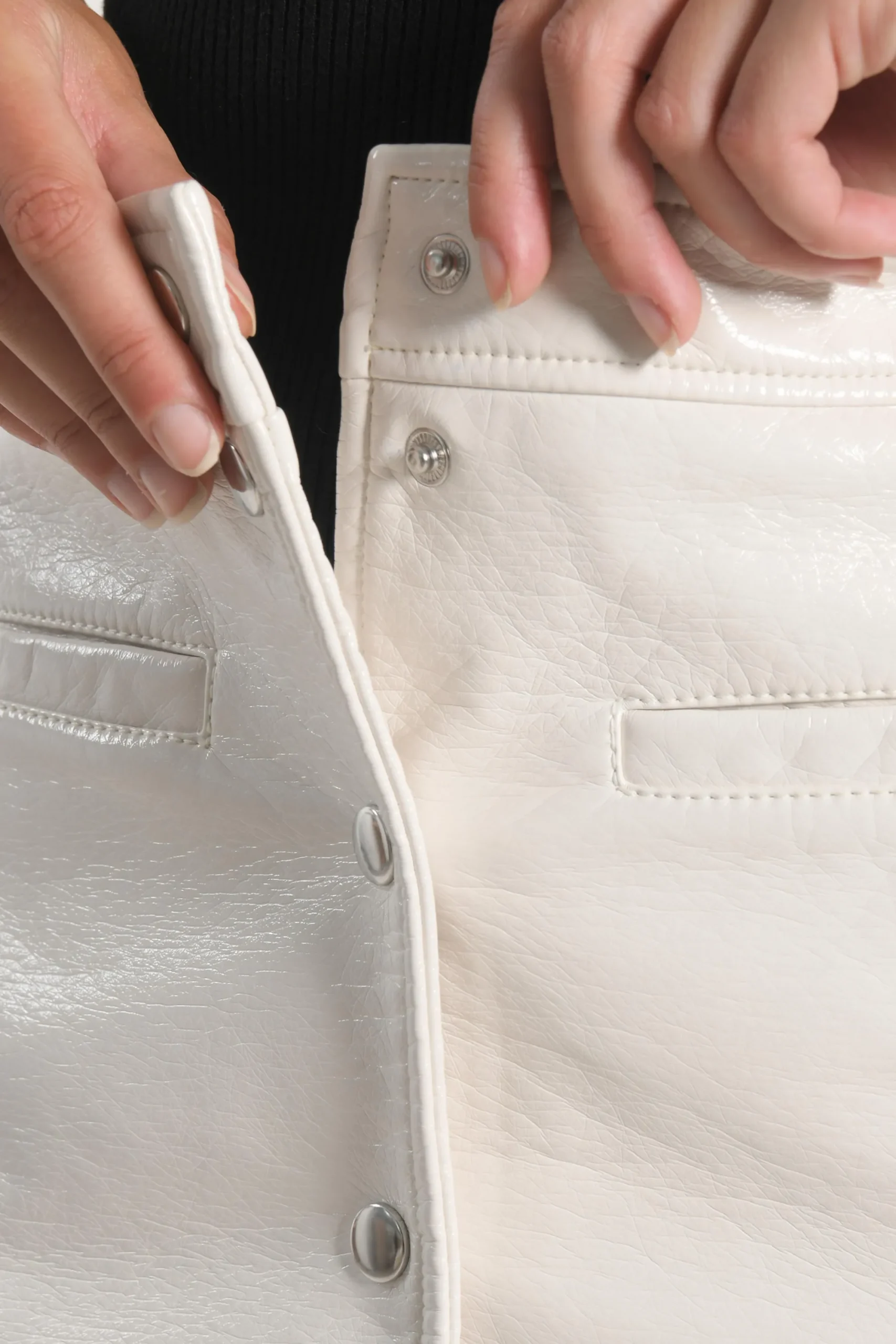 Jupe courte en simili cuir brillant façon vinyleFermée par des pressions apparentes milieu devantDeux poches passepoil…
