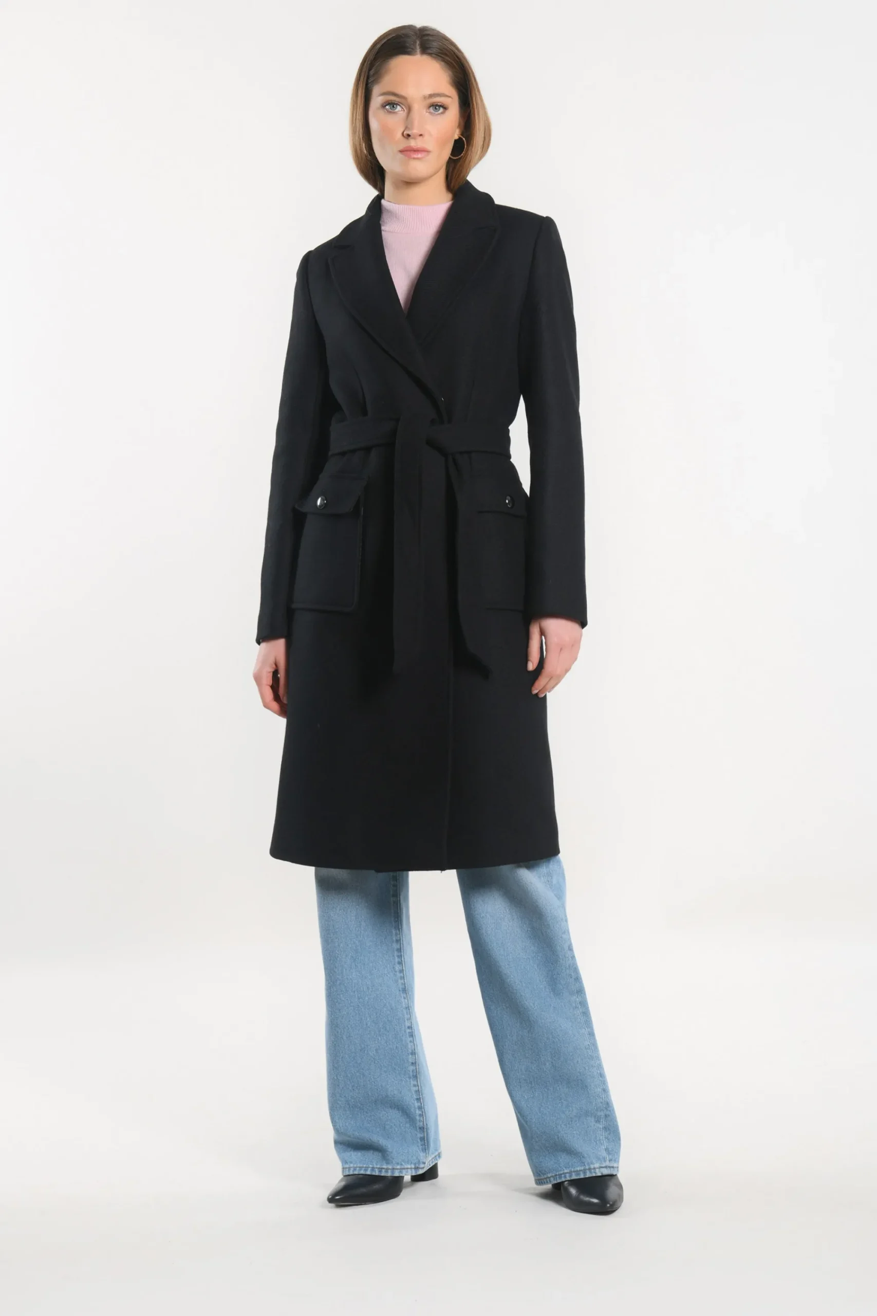 Manteau ceinturé en laine mélangée muni d’un col tailleur avec une double croisure invisible.2 Poches plaquées ave…